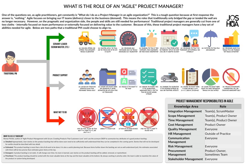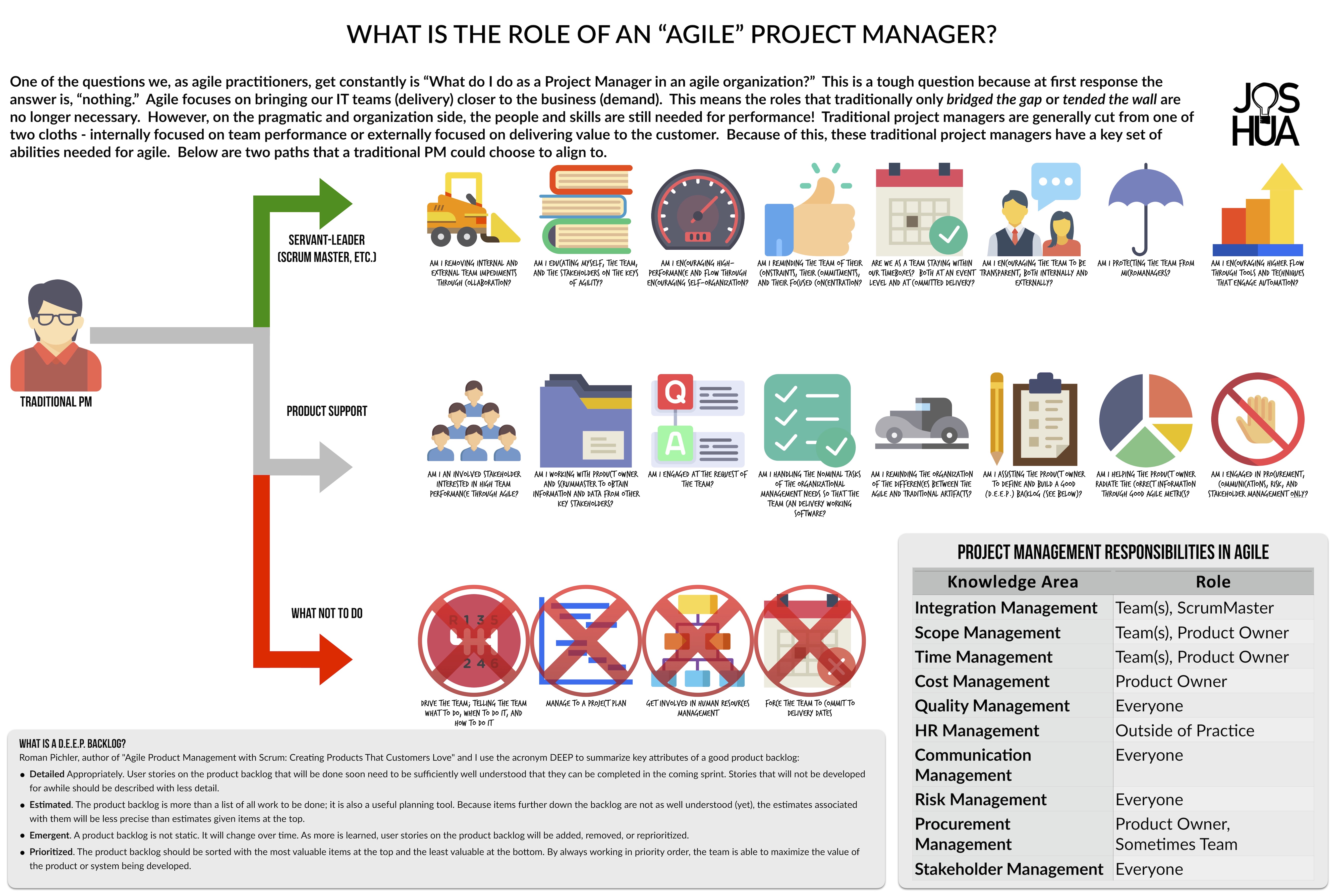 Oftentimes, I am asked, “what do we do with project managers as we adopt agility?” Being a self-proclaimed “recovering project manager” I am sensitive to the people who we are impacting, however, I am also extremely dogmatic on improving the business/IT relationship. Below is a brief infographic I threw together for some folks last year that outlines two possible approaches. Please note: it is rather large and also all opinion!
