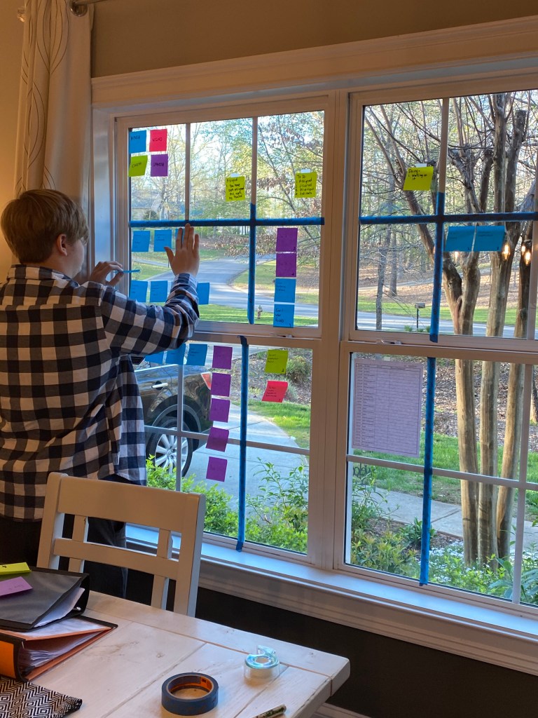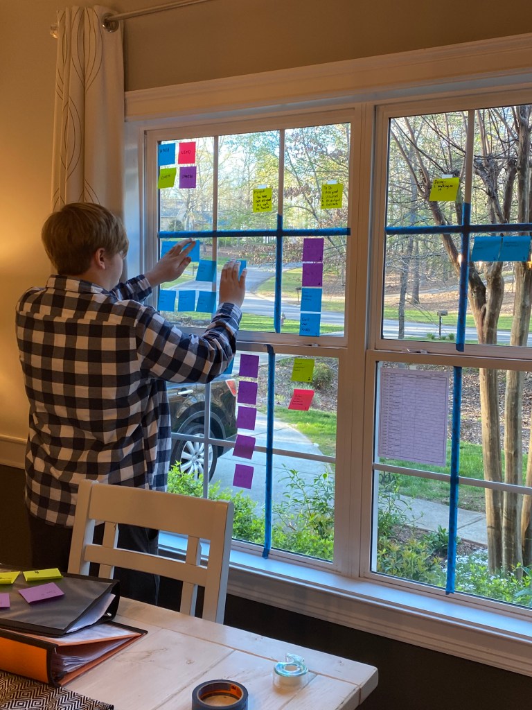 With E, we created a simple board. We talked through the meaning and the reason. I asked questions to get him to form structures around the concept. We talked about his entire body of work vs. the committed to body of work for the day. We discussed what each column meant. We color coded each subject not to silo but to understand where each requirement or task was coming from. At the end of the time, E had prioritized his work based on a timeline (first in, first out) approach, understood the work, estimated the work (using his done work as a relative “work per pomodoro’s” scale), committed (but not overcommitted) to the day’s work, and more importantly, felt that he could accomplish the goal. He saw “done” from just the few minutes of work this afternoon. Immediately we were on the same page, were functioning as a team, and had started collaborating.
