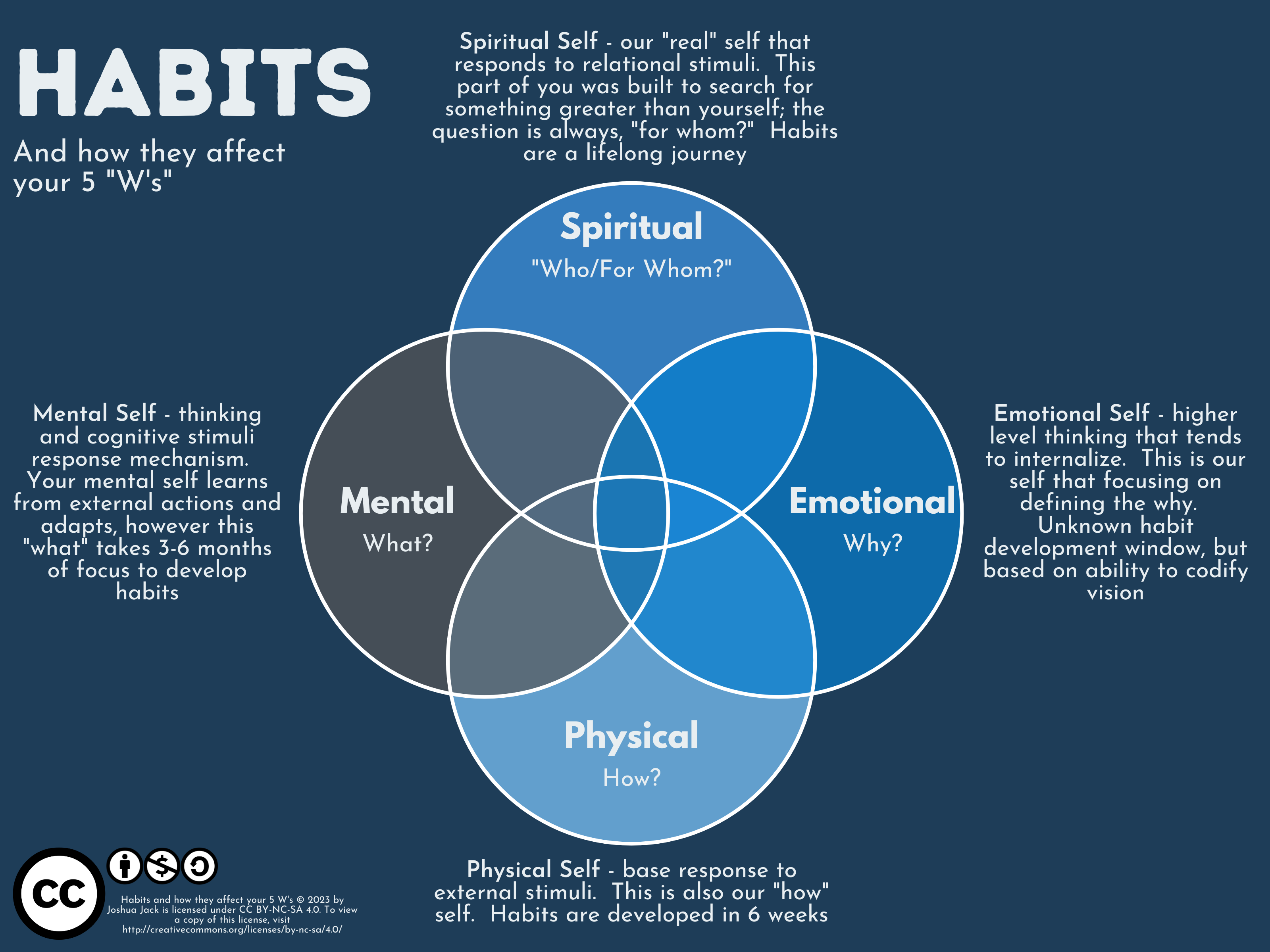 Mental Self – slightly aligned to the physical self, we tend to also respond with mental habits to external stimuli, although filtered through cognitive reasoning. For example, if I get speeding ticket after speeding ticket, I “relate” this pain or outcome to some action and will thus form a pattern of either risk or adaption, meaning I will start to form a habit of speeding to “get away with it” or slow down and drive more reasonably. The problem is that we oftentimes think we are smarter than we are and our habits are ill-formed. I may form procrastination habits because “I can pull an all-nighter and be a hero.” The mental self is related to our “what” or the things that make us who we are. These habits are formed more slowly and are reinforced by reasoning meaning they form more slowly. For good or bad, they are also displaced more slowly.